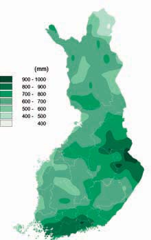 In 2004 the annual precipitation in extensive areas ranged between 600 and 900 mm, or was generally 1.2-1.3 times the longterm average. Precipitation was also exceptionally high in Lapland, in places exceeding 700 mm. The greatest annual precipitation, 1009 mm, was measured in Kivivaara, Lieksa, located in the hilly region of Northern Karelia. However, the greatest precipitation in 2004 still fell short of Finland's all-time record of 1109 mm, which was measured in Nupuri, Espoo in 1981.
