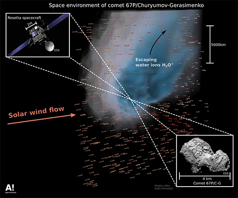 Professors Esa Kallio from Aalto University and Hannu Koskinen from the University of Helsinki have been analysing the Rosetta probe's measurements of the comet 67P/Churyumov-Gerasimenko since August 2014. The first water vapour jets from the comet were observed in September 2014, i.e. very early in the comet's awakening stage. The findings surprised the researchers.