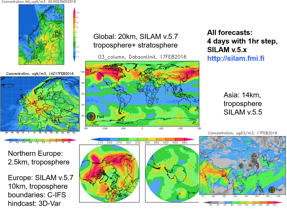 Air quality forecasts are presented at different scales, ranging from small to global scale applications. Forecasts are developed for different pollutants, especially particulate matter, nitrogen oxides, and ozone.