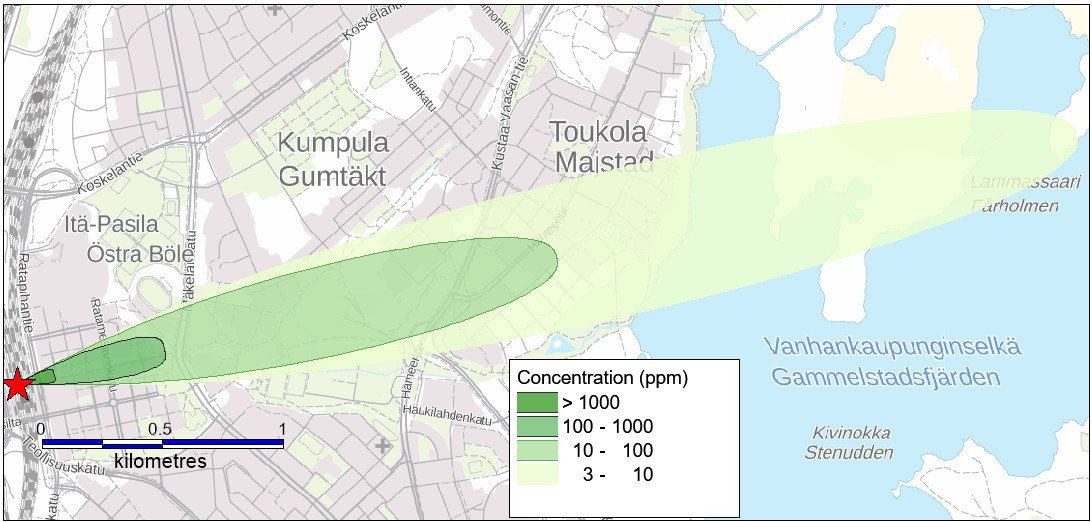 Consequences of chemical accidents can be estimated by a modelling system that contains discharge models, source term models, dispersion models and impact analysis models, developed at the Finnish Meteorological Institute. The dispersion model ESCAPE (Expert System for Consequence Analysis and Preparing for Emergencies) is a validated assessment tool for the consequence analysis of accidents involving hazardous materials. The mathematical structure and evaluation of the model has been described by Kukkonen et al. (2017).