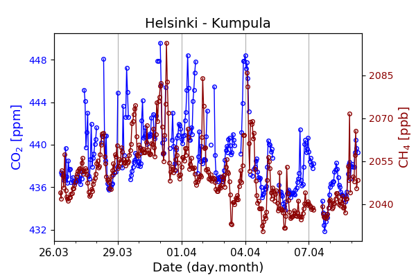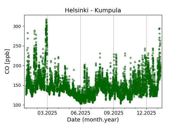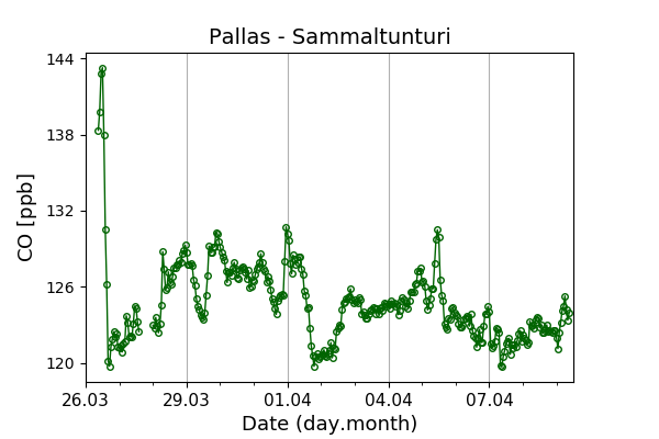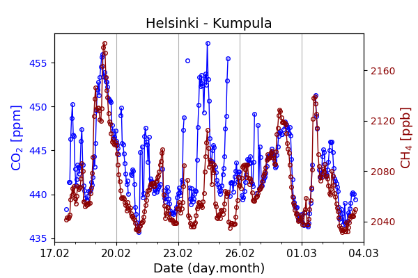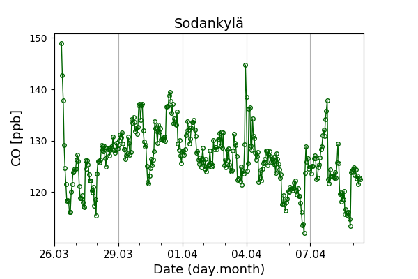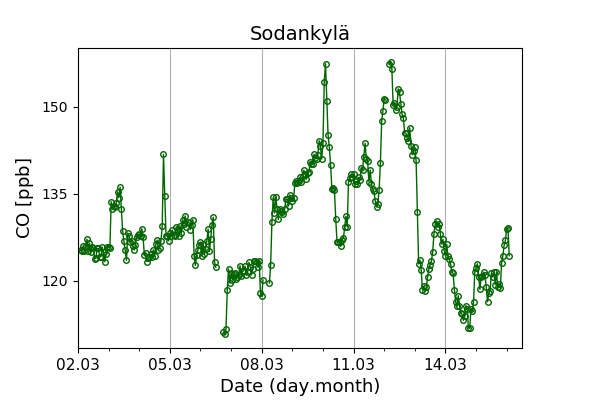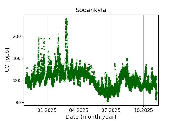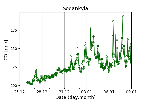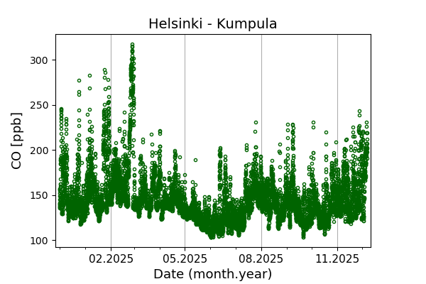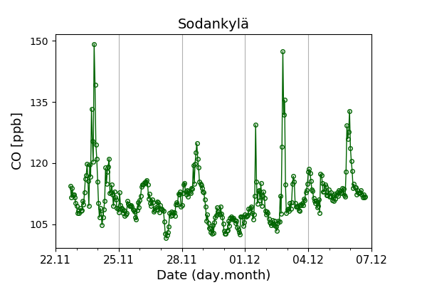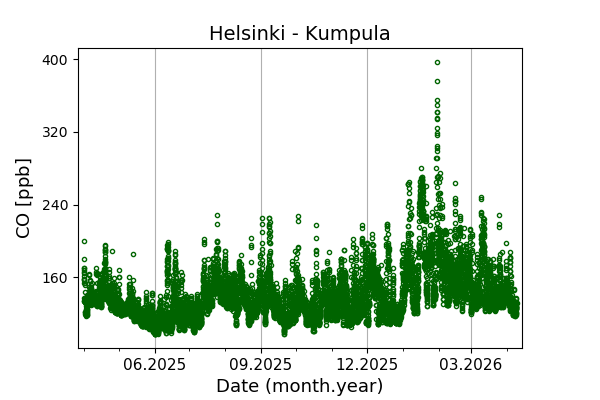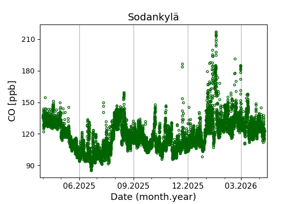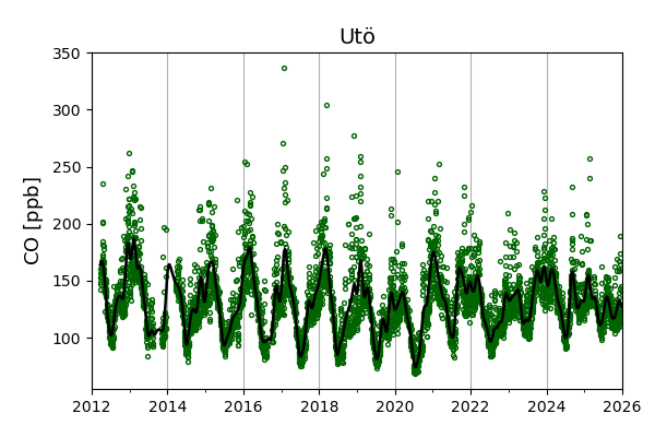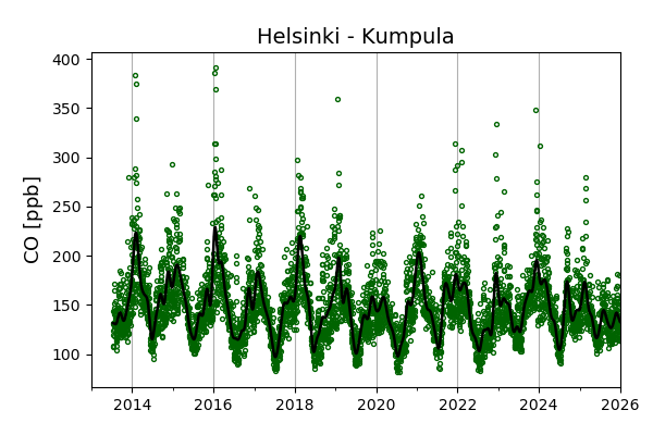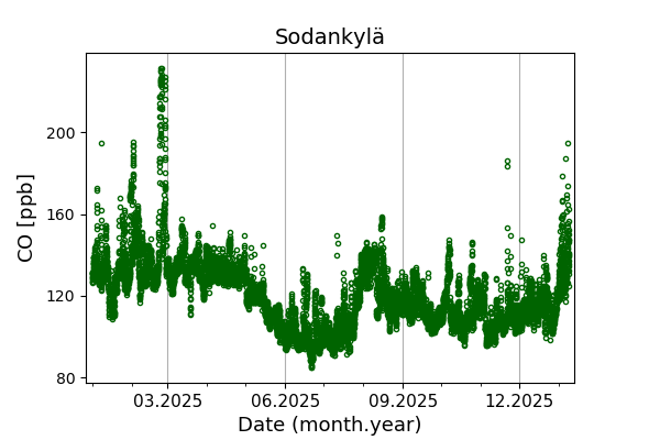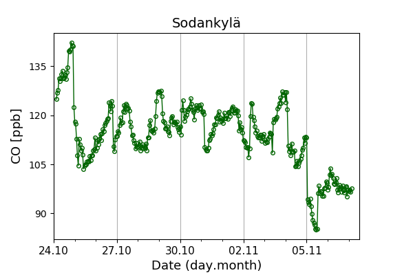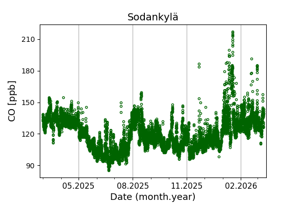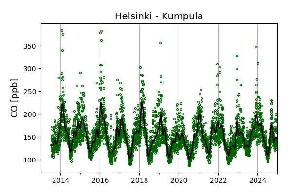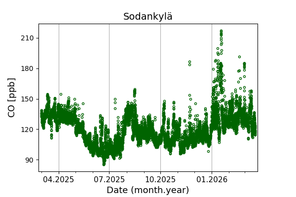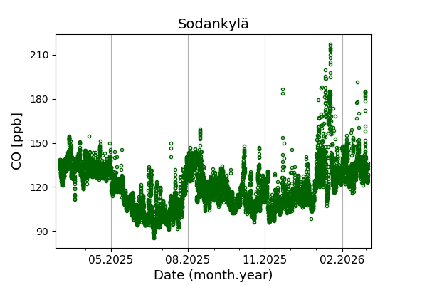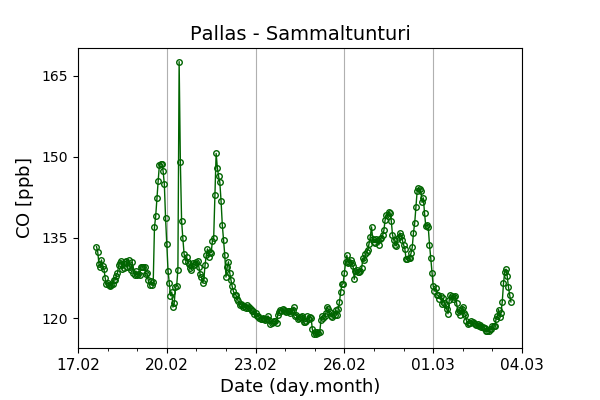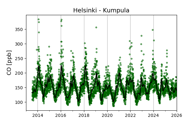 Concentrations of carbon dioxide (CO₂), methane (CH₄), and carbon monoxide (CO) are shown from observations at Pallas-Sammaltunturi, Sodankylä, Helsinki-Kumpula, and Utö.