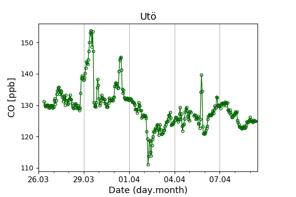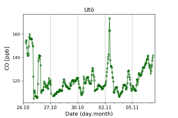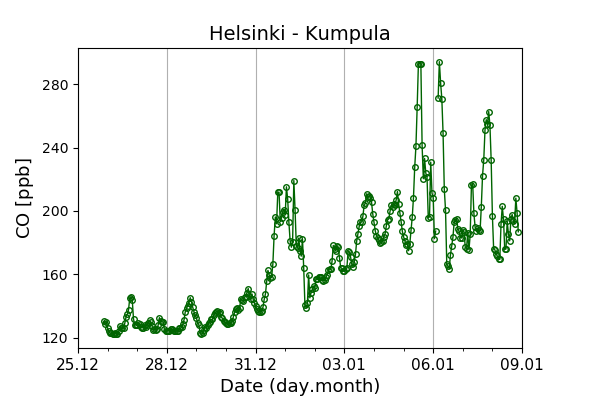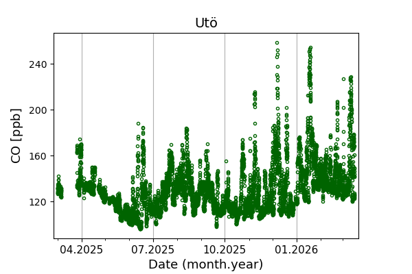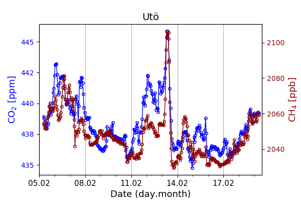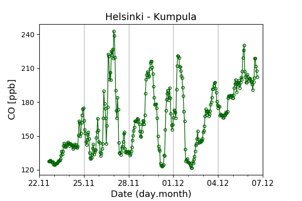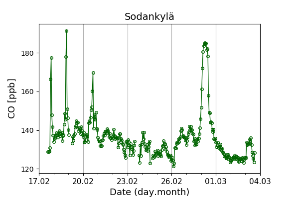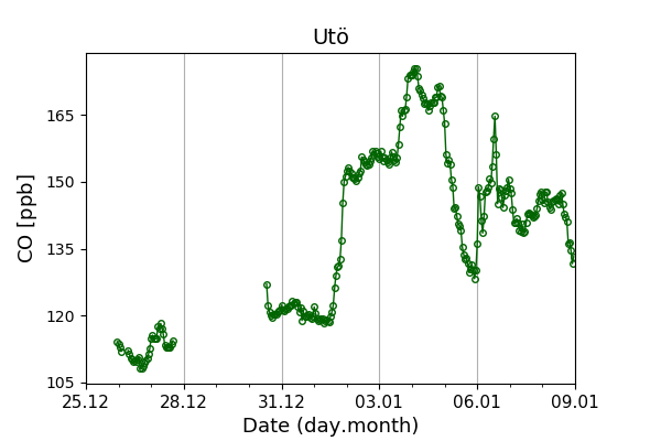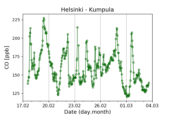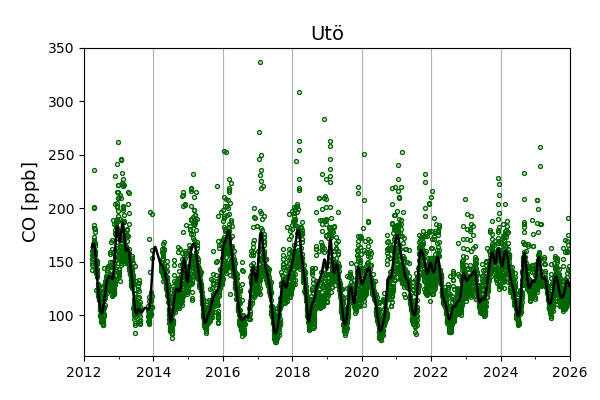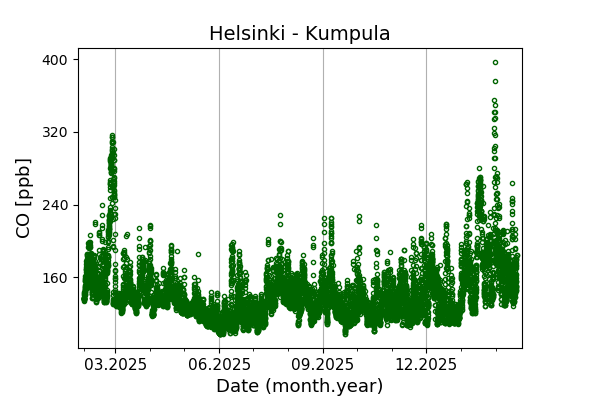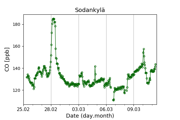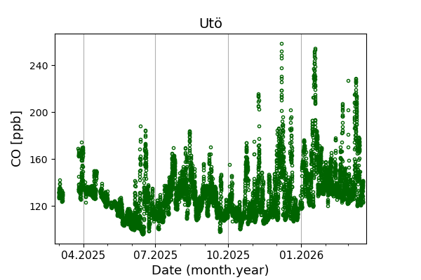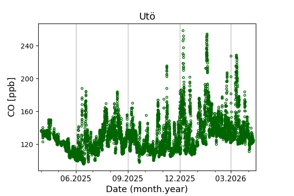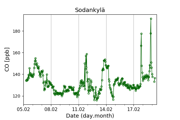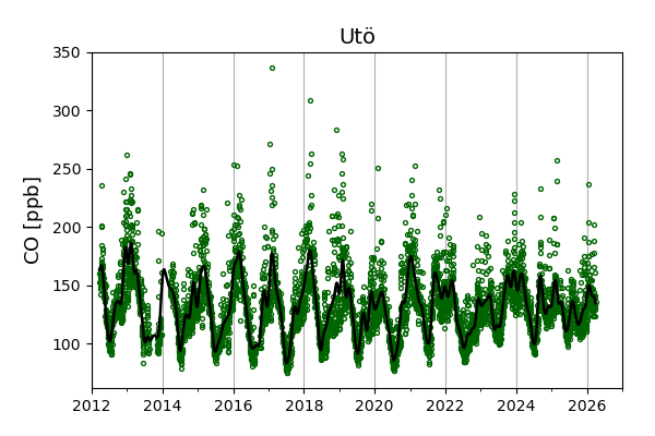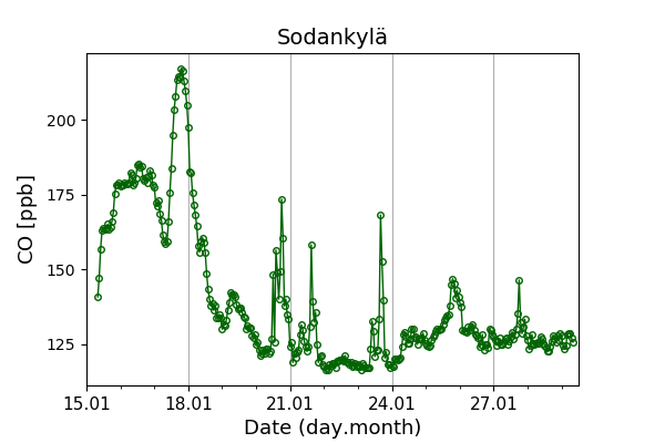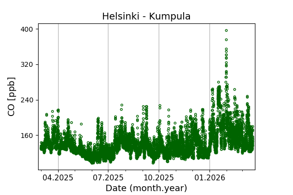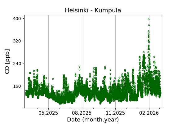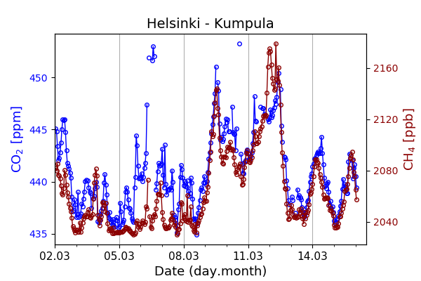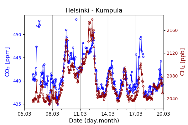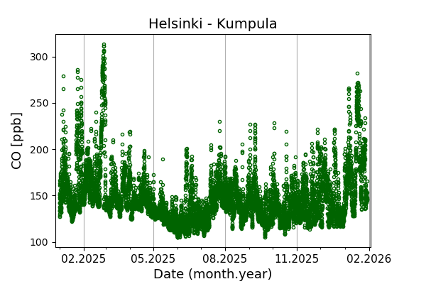Concentrations of carbon dioxide (CO₂), methane (CH₄), and carbon monoxide (CO) are shown from observations at Pallas-Sammaltunturi, Sodankylä, Helsinki-Kumpula, and Utö.