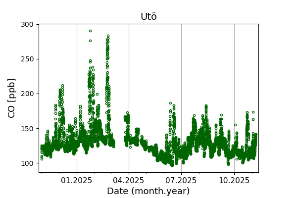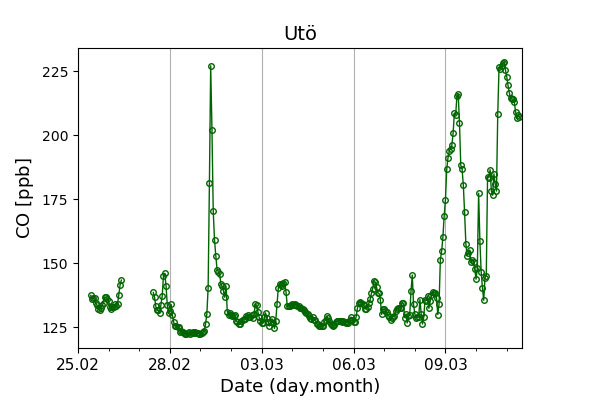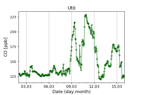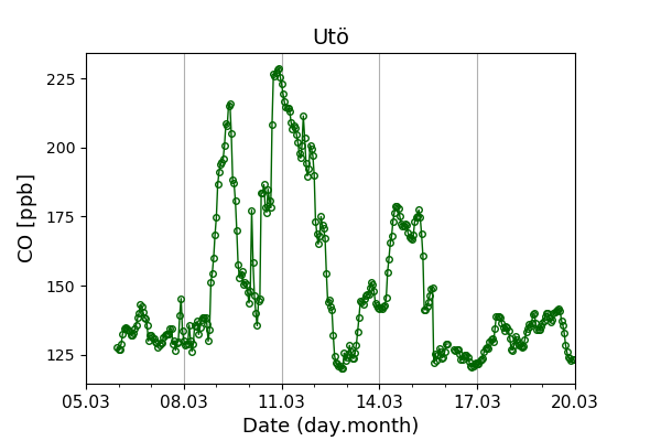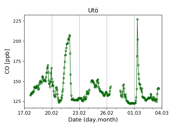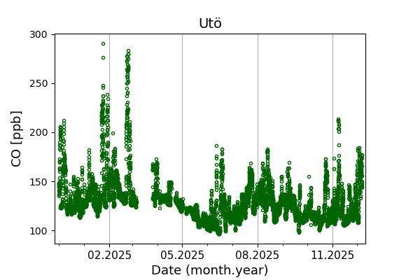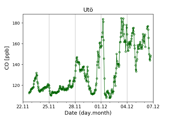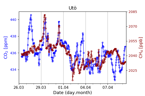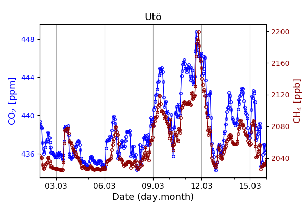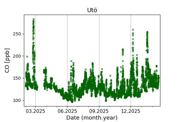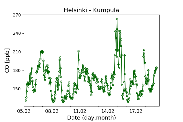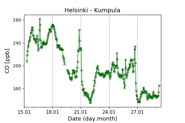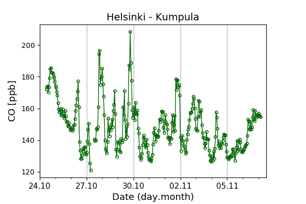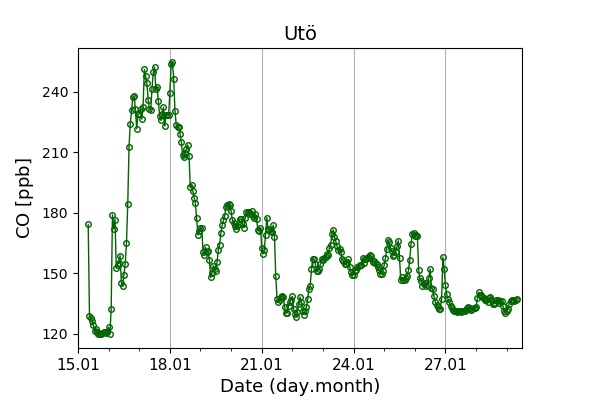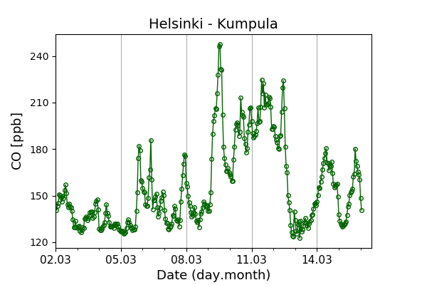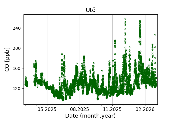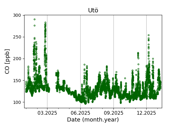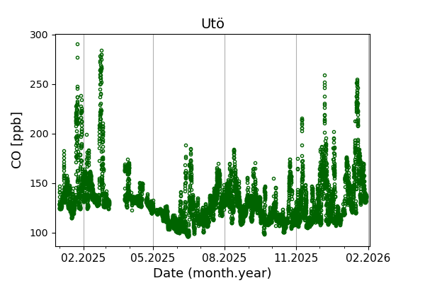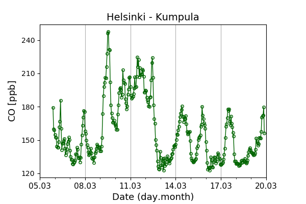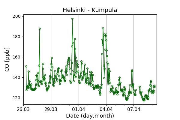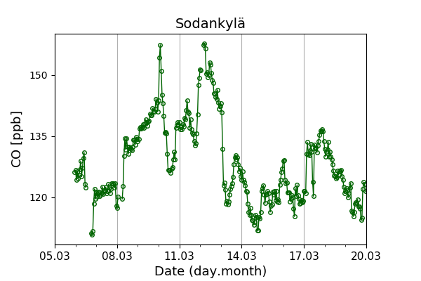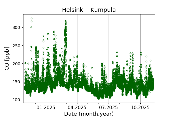 Concentrations of carbon dioxide (CO₂), methane (CH₄), and carbon monoxide (CO) are shown from observations at Pallas-Sammaltunturi, Sodankylä, Helsinki-Kumpula, and Utö.