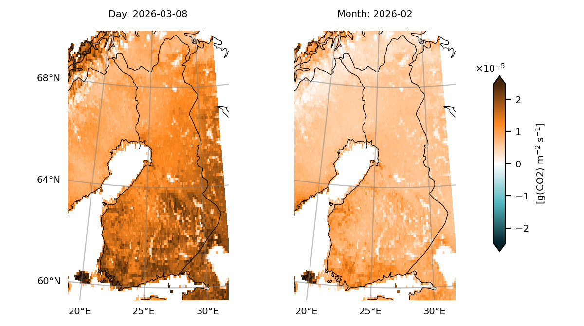 The inputs to JSBACH-HIMMELI include land cover maps, which are often static, and atmospheric variables, such as air temperature, wind speed, solar radiation, air humidity, precipitation, and atmospheric CO₂ concentration, which can be obtained from reanalysis data that is updated with a relatively short time lag of a couple of days. Therefore, we can also obtain process-model based greenhouse gas flux estimates with a lag of a week. With this, we can study timely issues, for example, how a warm autumn affected the CO₂ and CH₄ emissions from Finland’s peatlands in 2025. However, as the modelling results are dependent on the meteorological data used, any biases in these datasets can also cause biases in the greenhouse gas emission estimates. The reanalysis of meteorological fields relies on observations of which some become available only after a while. Thus, using updated meteorological data relying on more observations also gives us more reliable greenhouse gas emission estimates. Similar to many operational data products, the near-real-time estimates serve as our best estimate at the time, and later added information can change the greenhouse gas budgets.