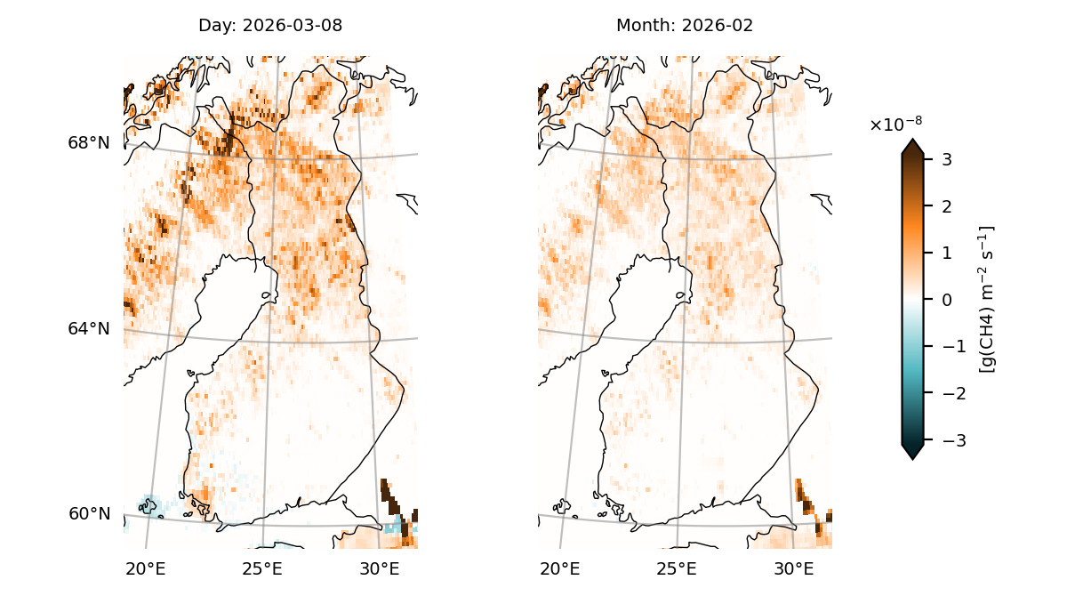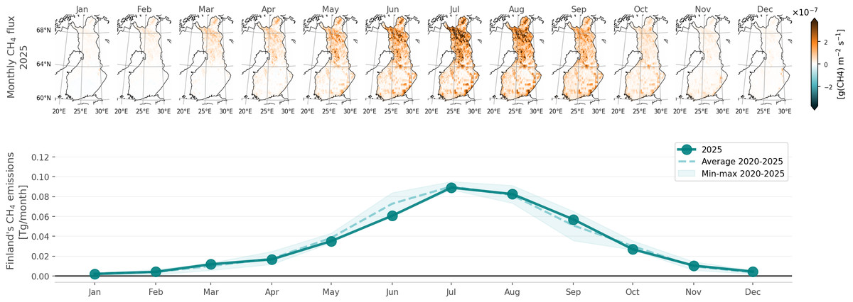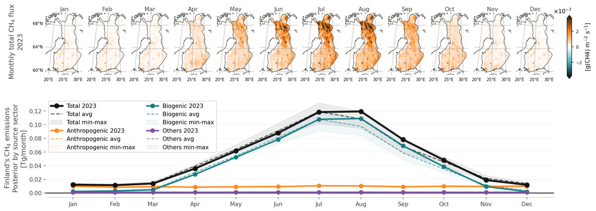 When it comes to CH₄, Finland’s land ecosystems are mostly a net source. This is due to extensive wetland areas in Finland. Both JSBACH-HIMMELI and CIF-FLEXPART-FMI show the highest CH₄ emissions in northern Finland, where the largest pristine peatland areas are located. CH₄ emissions are very small in December to February, start to increase in March, peak in July-August, and then start to decrease in September. The biospheric emissions in CIF-FLEXPART-FMI estimates also include emissions from freshwater systems, which are not included in the JSBACH-HIMMELI estimates. They have similar seasonality to wetland emissions, and most of these emissions originate from southern Finland, which can be seen as a darker orange colour in the map images.