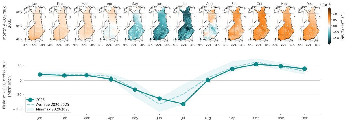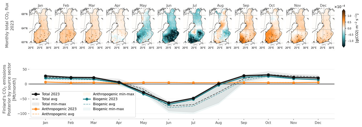 Anthropogenic emissions (both CO₂ and CH₄) have much less pronounced seasonality than land-ecosystem emissions. Thus, the seasonality of the total greenhouse gas budgets is also determined by the land-ecosystem emissions’ seasonality. Based on JSBACH-HIMMELI and CIF-FLEXPART-FMI, land ecosystems in Finland are a net source of CO₂ from September to March on a monthly level. In April and August, the northern part of Finland is a net source but photosynthesis in the southern part of Finland already overcomes the respiration. From May to July, almost all of Finland is a net sink.