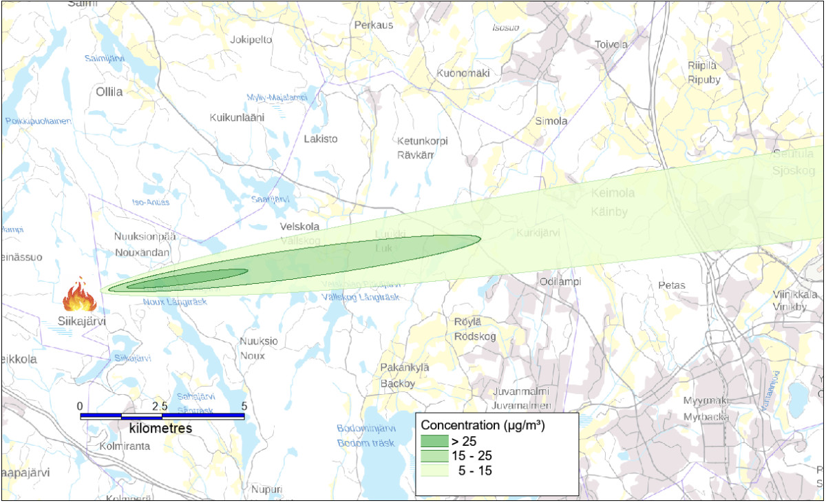 The model can be used for evaluating the formation of source terms, plume rise, and atmospheric dispersion of harmful chemicals. The model is applicable to evaluate the local and regional scale atmospheric dispersion of gases and particles originated from, for instance, forest, warehouse and liquid pool fires. A potential predicted concentration distribution of particulate matter (PM₂.₅) near ground level has been illustrated in the example figure.