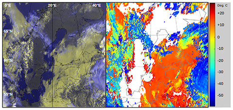 Figure 1. Left panel: Satellite image of the clouds 22 July 2016, 12 UTC. Light blue-white color indicate high clouds (Cirrus) and yellow color show low-middle high clouds (Cumulus, Stratus and Alto Stratus). Right panel: Interpreted cloud-top temperatures derived from the satellite image, which are used as input for the forecast model to detect cloud-tops. Low clouds have higher temperatures compared to clouds at high altitudes (see temperature bar on right side, degree Celsius).