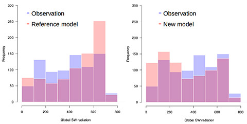Results have shown that the weather prediction model over-predicts the solar radiation in the first hours of the forecasts (see figure 2, left panel), because of either a displacement of the cloud field or too transparent clouds. The new approach of starting the forecast model with a more accurate cloud field is investigated in model experiment, where we run the weather forecast model for one month (July 2016) over Scandinavia domain and produce forecast out to +48 hours (i.e. 2 days) twice a day. The first results from our new experiment show that we are able to improve the cloud-free situations, i.e. the high radiation values (~700 W/m2) are lowered and are now at the same level as the observations (see Fig. 1). On the other hand, it is also seen that we underestimate the solar radiation in cloudy situations (see figure 2, right panel).