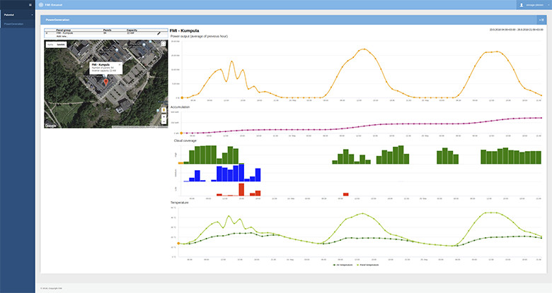 The forecast, which is updated four times per day and extends to 66 hours ahead, is based on the joint Nordic MetCoOp weather forecasting system with a horizontal resolution of 2.5 kilometers. The service provides a personalized interface where one or multiple photovoltaic systems can be defined.