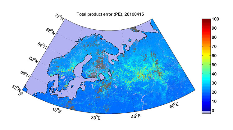 Figure: The total product error is demonstrated here for Northern Europe by applying the GlobSnow Snow Extent (SE) product on fractional snow cover(FSC %-units). Clouds are depicted in brown-grey colour.
