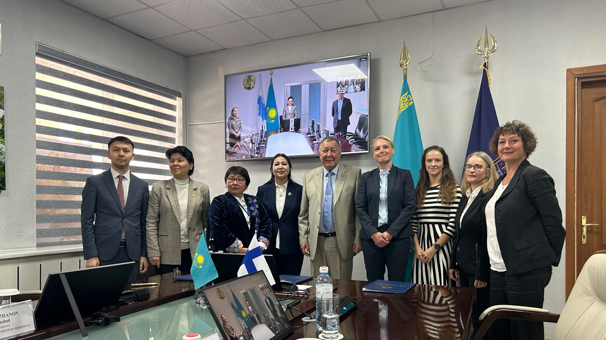 The memorandum signature meeting was attended by acting Deputy Chairman of the Board - First Vice-Rector of KazNU Erkin Duisenov, Director General of RSE ‘Kazhydromet’ Danara Alimbayeva, Head of the Air Quality Department of the Finnish Meteorological Institute Katja Loven and Deputy Head of Finland Mission in Kazakhstan Helena Bogdan.