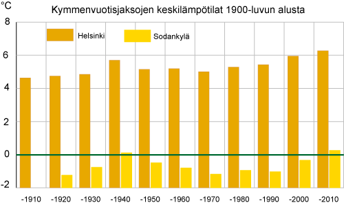 The changes in the mean temperatures can also be viewed in 10 year periods. In the figure below, the 10 year mean temperatures are shown for Helsinki and Sodankylä spanning in total approximately 100 years each.