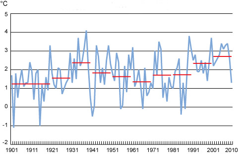 The annual mean temperatures for 1901–2010 are marked in blue and the mean temperatures for each decade in red.