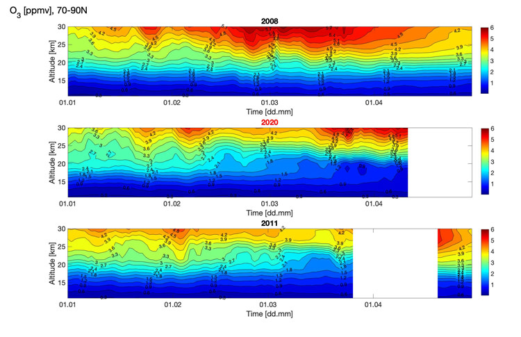 Unusual ozone hole opens over the Arctic (news on ESA website 6.4.2020)