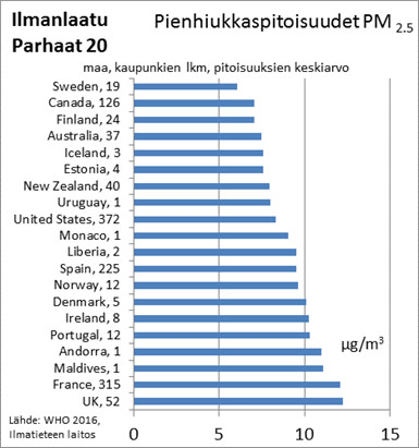 This was revealed by the extensive database published by the WHO, which includes measurement data on particulate matter from 3 000 localities in a total of one hundred countries between 2008 and 2014. In addition to Finland, the air in Sweden, Iceland and Estonia is clean, i.e. particle concentrations remain under 10 µg/m3 in comparisons with other European countries. Countries such as Canada, Australia and New Zealand are in the same top class in global comparisons.