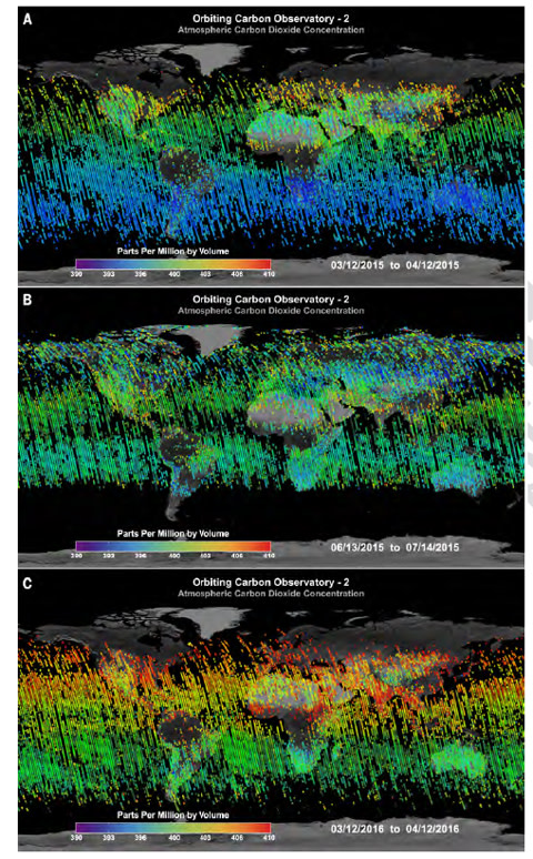 Earth is "breathing": Maps of OCO-2 XCO2 over 32-day periods in (A) March/April 2015, (B) June/July 2015, and (C) March/April 2016. Themeasurement area of each sounding has been exaggerated for visibility on a global scale. (Reprinted with permission from Eldering et al., Science 358:5745 (2017)