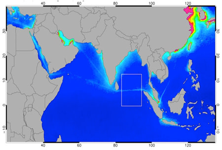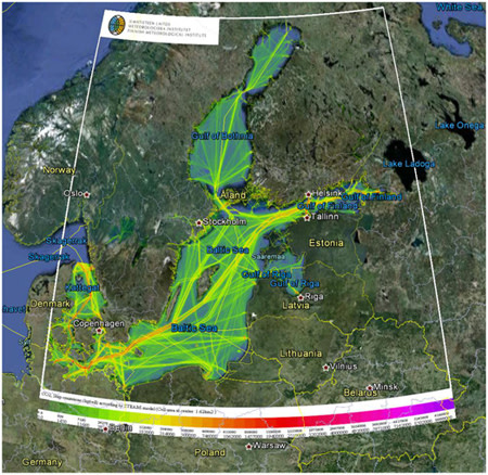 Photo 3. Shipping lanes are clearly seen already in present satellite observations. Atmospheric NO2 concentration is shown.