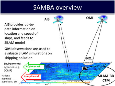 In the first stage, the objective of SAMBA is to establish the feasibility of space-based services for maritime emission monitoring. SAMBA will achieve its objective by combining AIS/GPS-based maritime emissions with remote sensing-based atmospheric pollution monitoring into maritime emission compliance monitoring and information provision service.