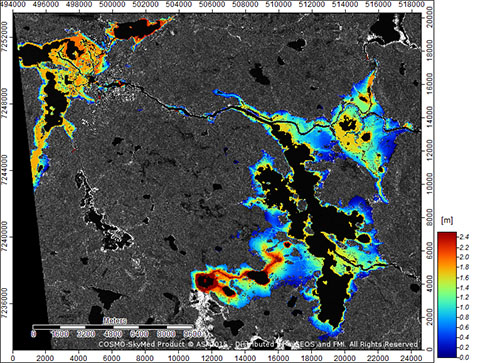 In the image, the extent of the floods and the depth of flood water in the Pudasjärvi and Jongunjärvi areas are presented on top of a SAR image taken from a COSMO-SkyMed satellite. In addition to imagery from the COSMO-SkyMed satellite, images from the Sentinel-1 satellite are also utilised in the flood analysis.
