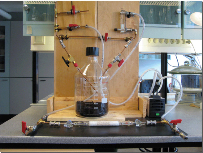Fig. 3. Special equipment is used to collect carbon dioxide from soil samples for measuring the 14C activity of soil respiration. The carbon dioxide is trapped to a molecular sieve (the white tube in front of the bottle). The special tubing and the valves are needed to flush the system and keep it free of outside air while collecting the carbon dioxide for the 14C measurements.